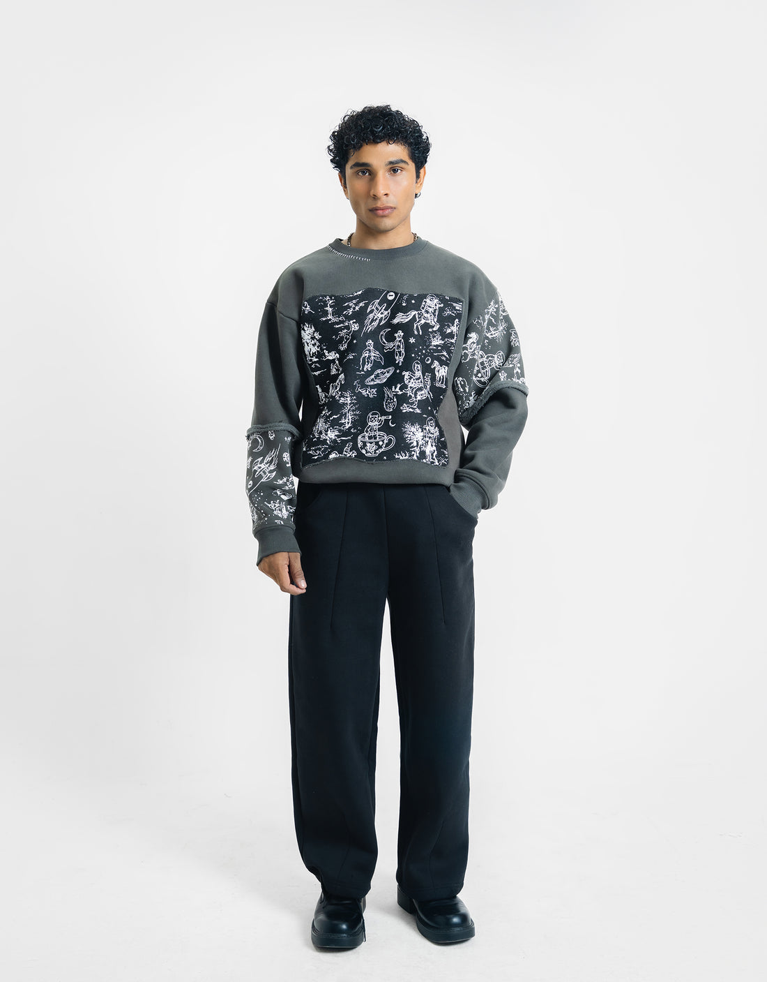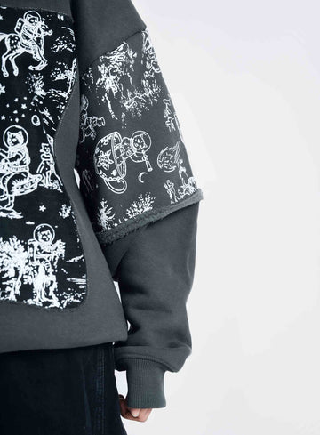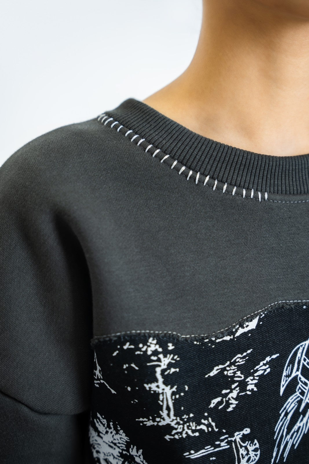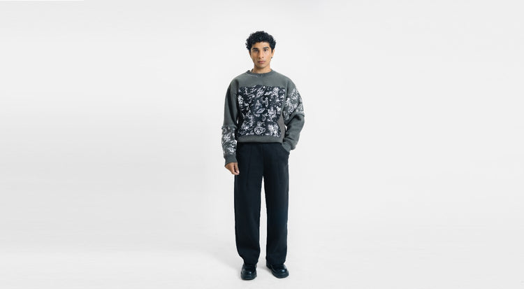 A statement charcoal sweatshirt designed with layered textures and bold detailing. Featuring a large printed patch across the front, complemented by subtle sleeve print accents and striking white contrast stitching at the neckline. Finished with a distressed denim “VASTAH” cut-out patch at the back, this piece blends raw craftsmanship with modern street-luxury aesthetics.