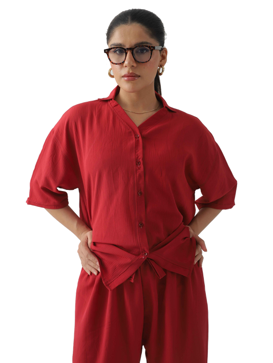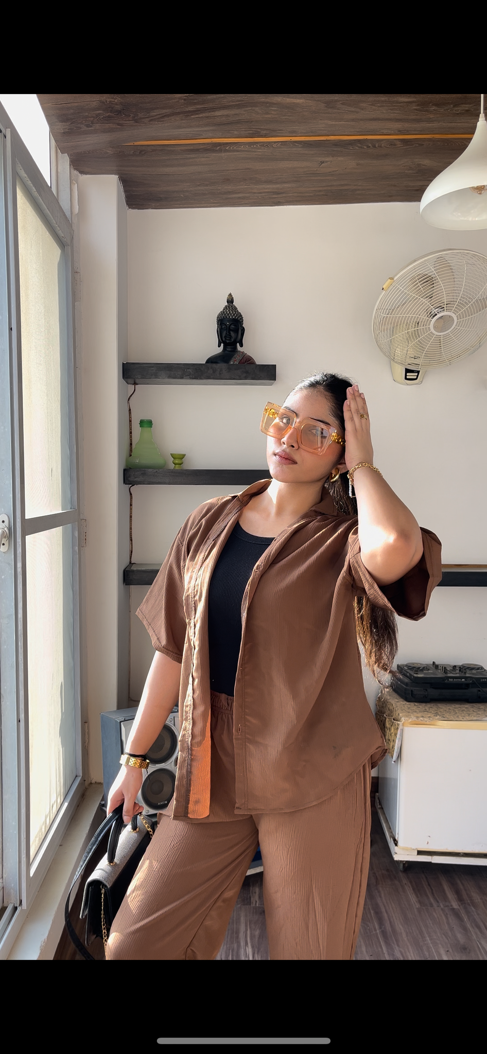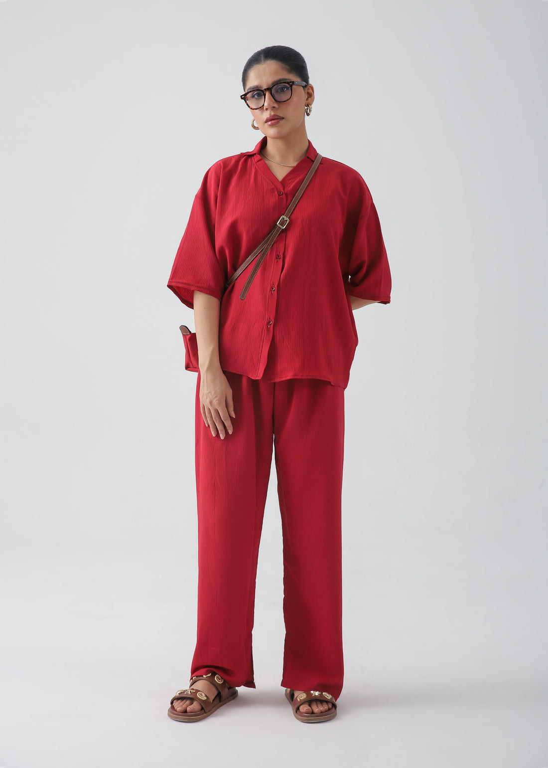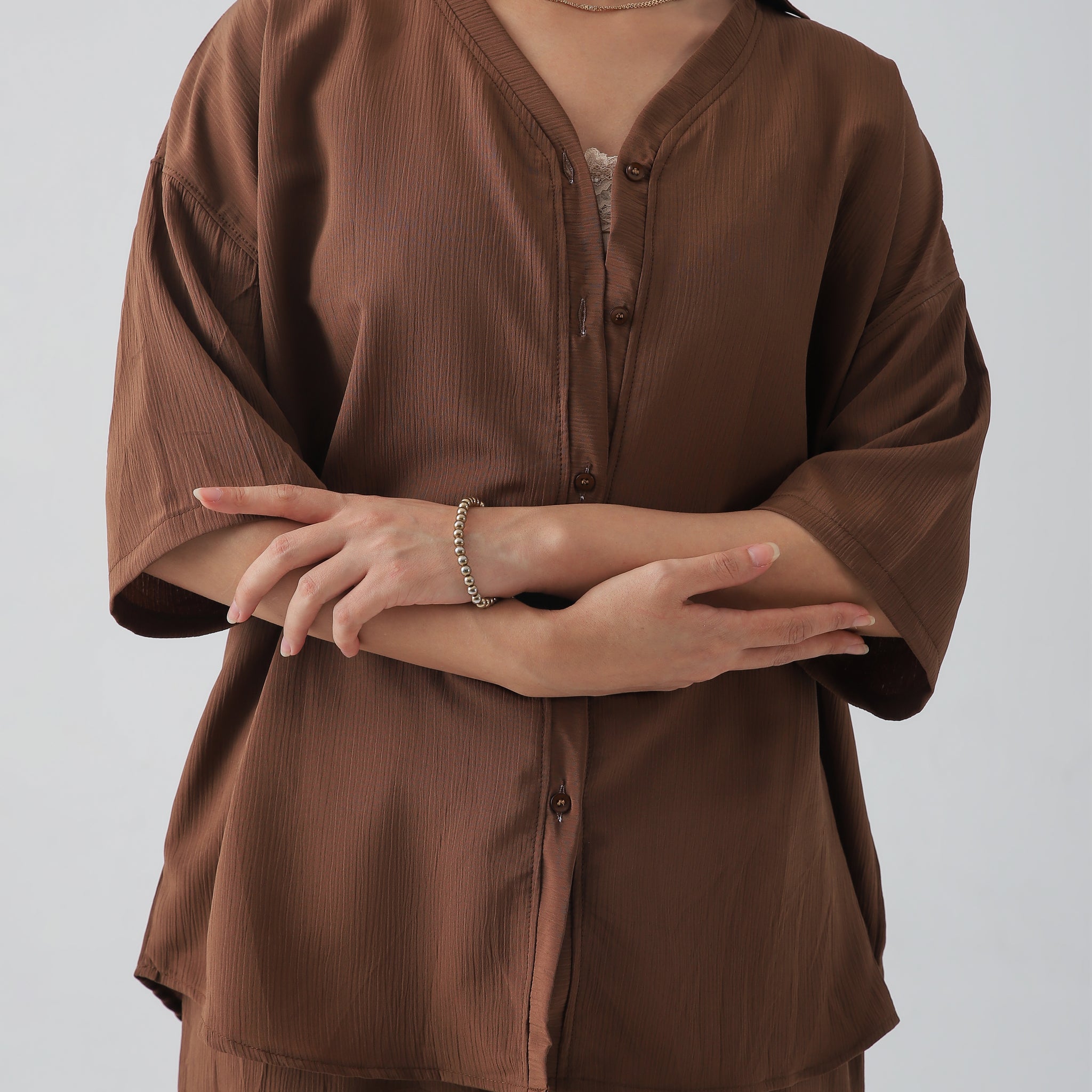 This soft cord-set features a relaxed fit with clean, seamless shoulder lines, allowing the top and trousers to drape naturally—crafted for effortless comfort and refined everyday style.