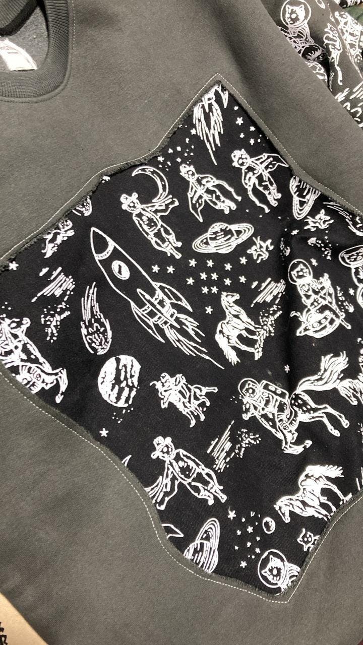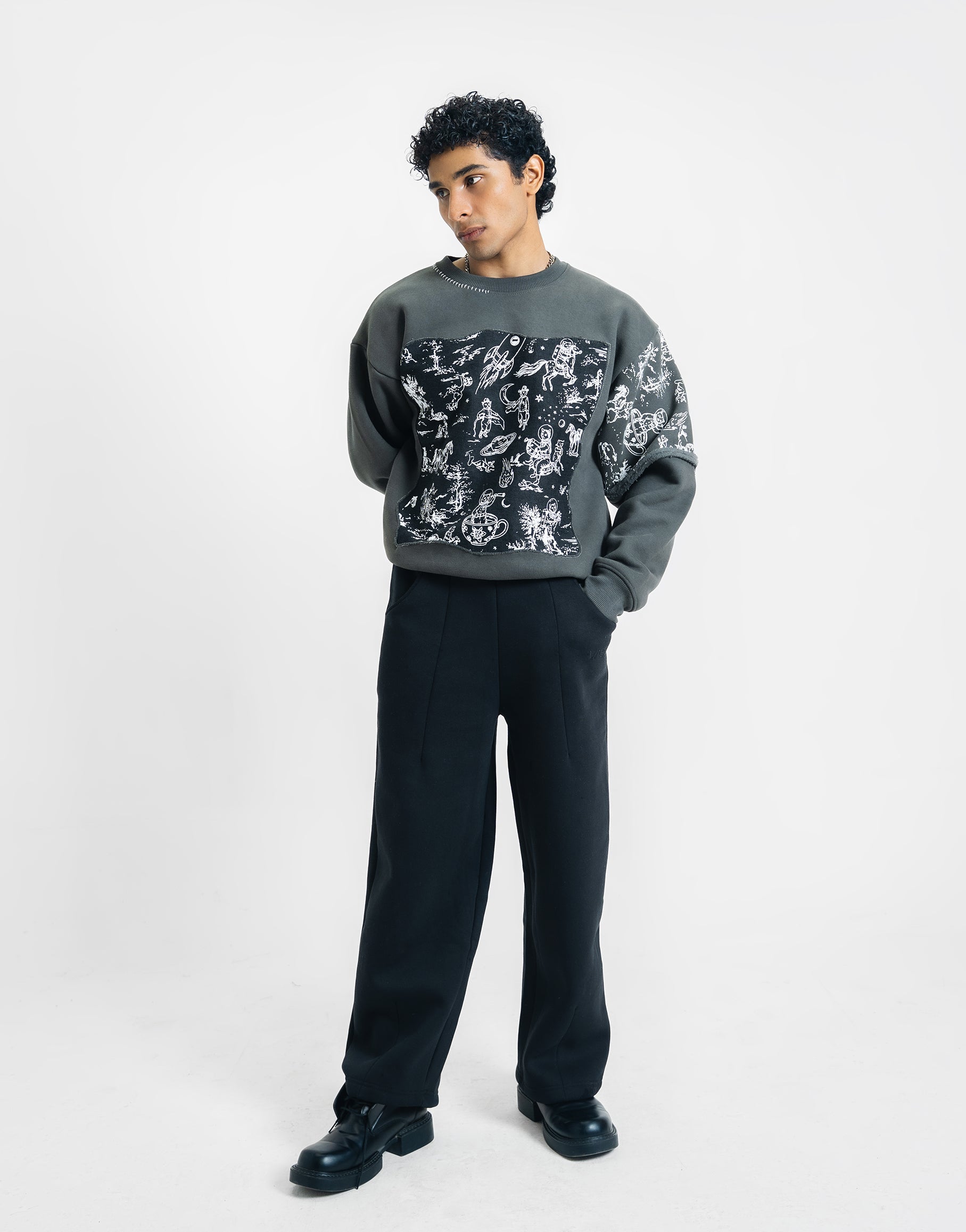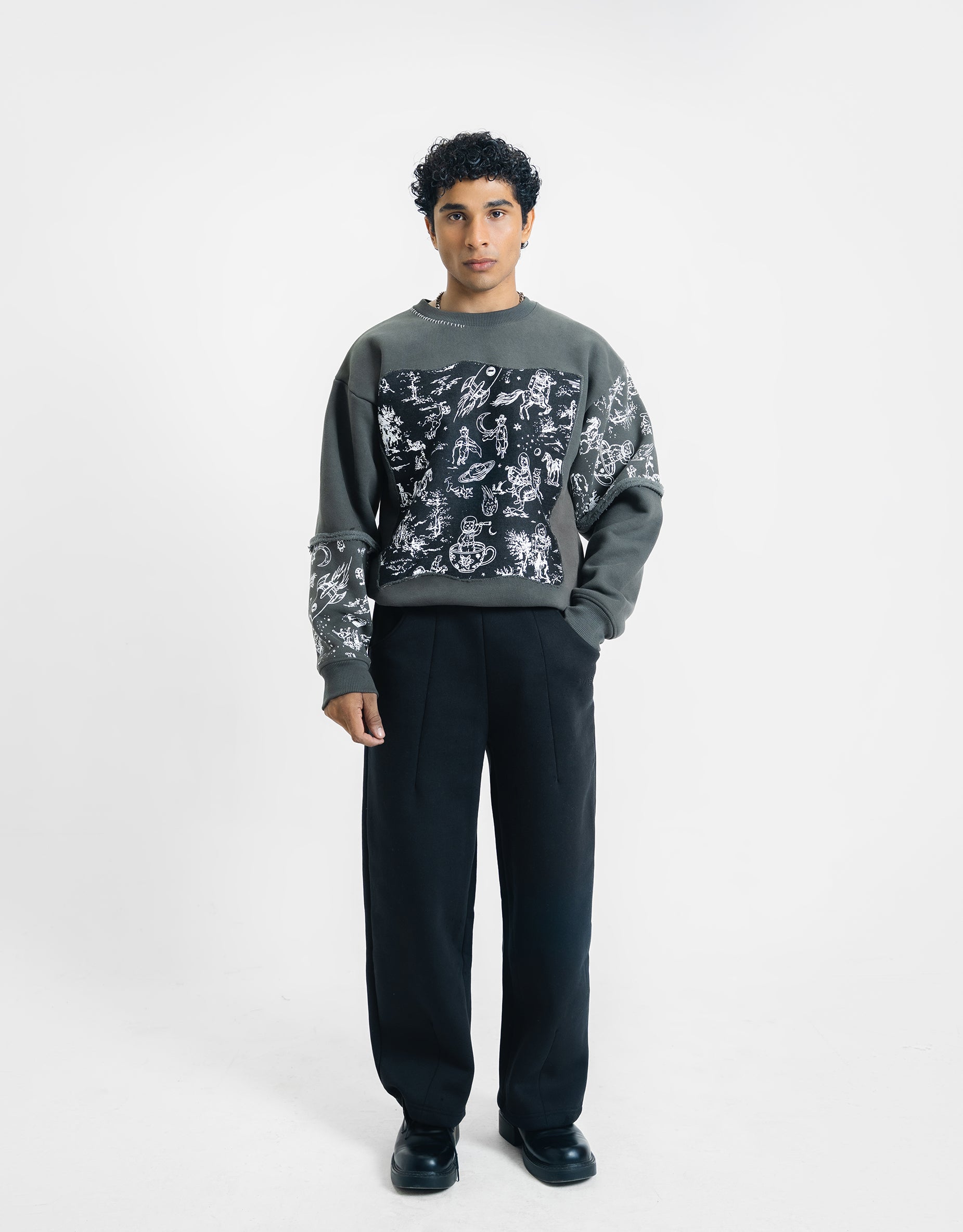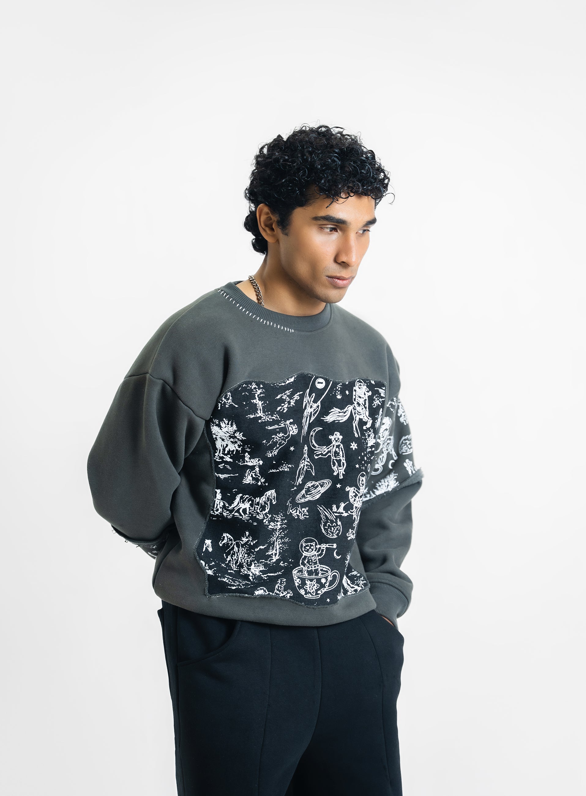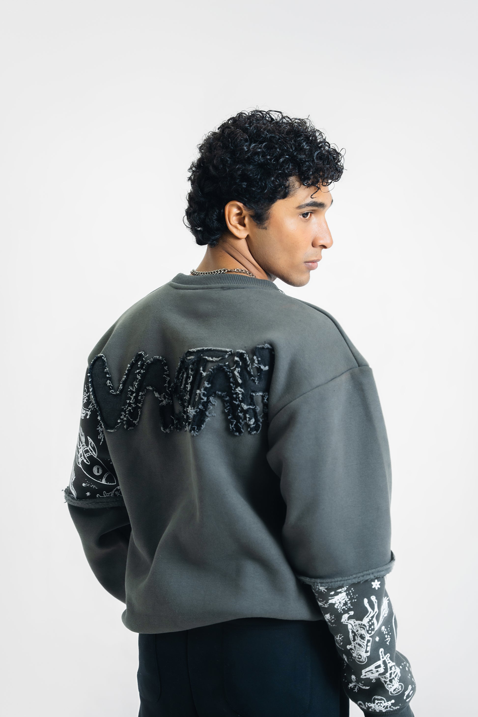 A statement charcoal sweatshirt designed with layered textures and bold detailing. Featuring a large printed denim patch across the front, complemented by subtle sleeve print accents and striking white contrast stitching at the neckline. Finished with a distressed denim “VASTAH” cut-out patch at the back, this piece blends raw craftsmanship with modern street-luxury aesthetics.