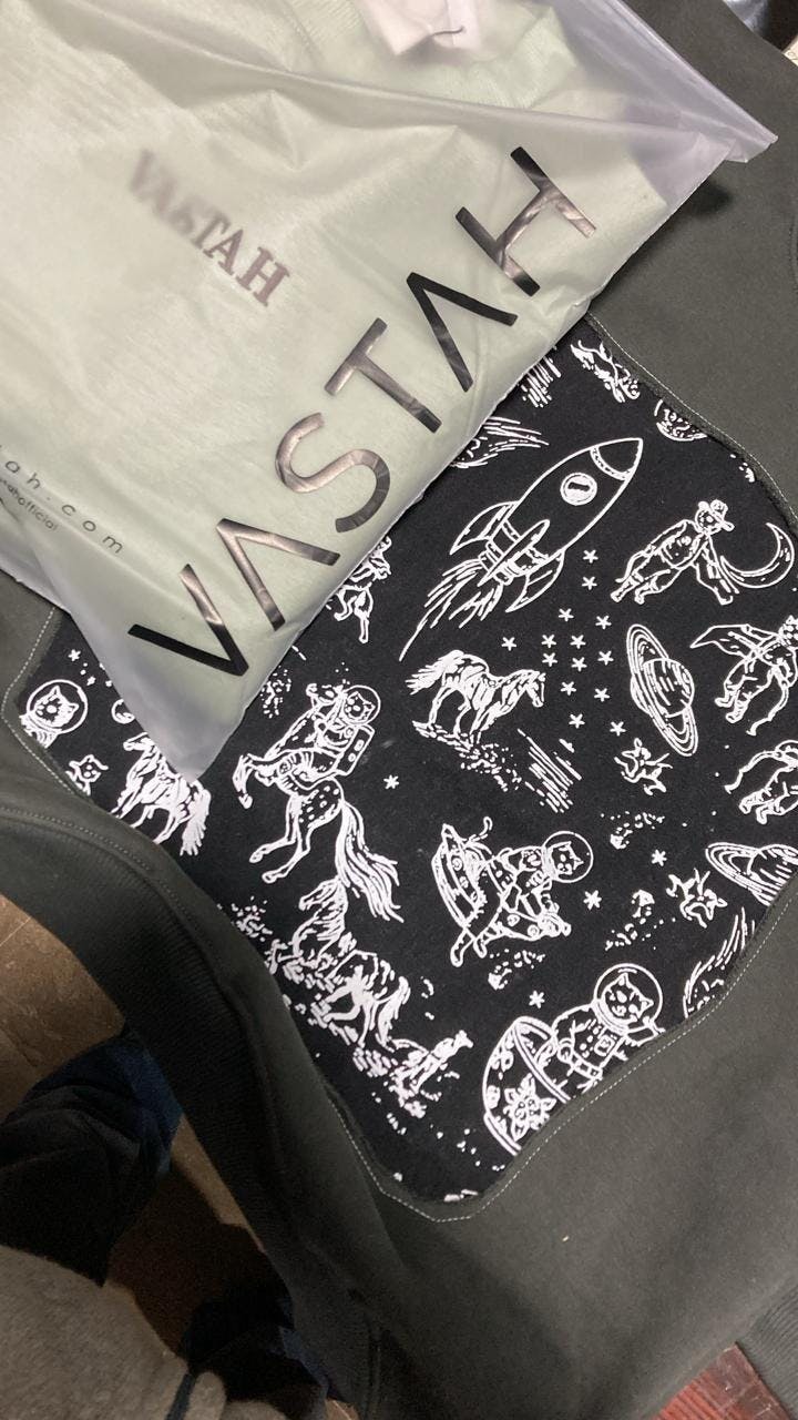 Details:Oversized front denim patch with printed artwork · Matching print detail near cuffs on both sleeves · Bold white contrast stitching at neckline · “VASTAH” denim cut-out patch with distressed edges on back