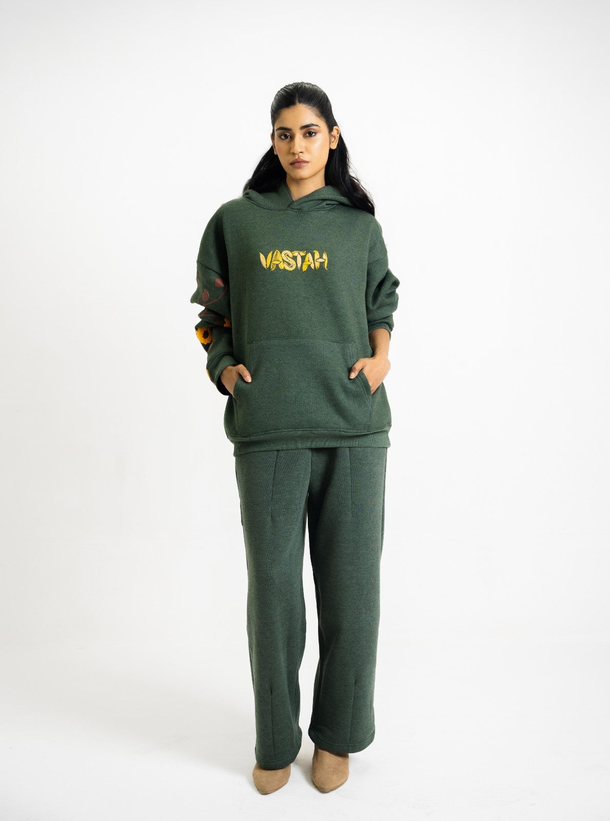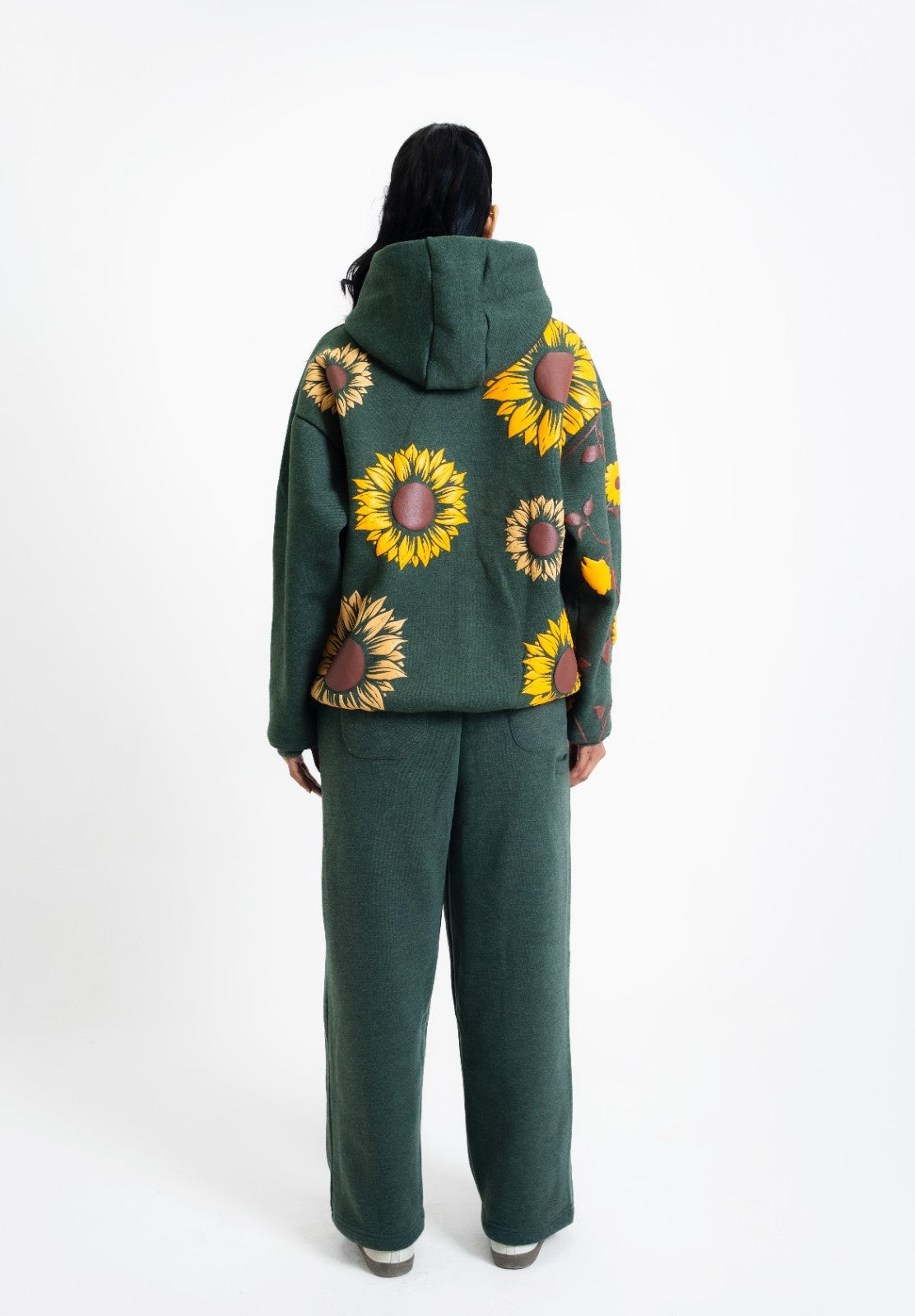 Details: Sunflower artwork on back in puff print · Sunflower with dandelions on sleeve in puff print · Matching trouser with “VASTAH” embroidery near the pocket