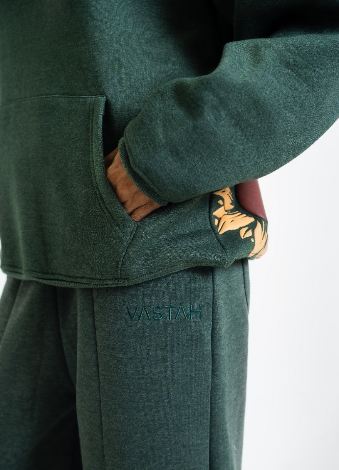 A heavyweight cotton fleece cord set designed for warmth and bold expression. Crafted in an oversized silhouette, it features raised sunflower artwork in puff print across the back, complemented by sunflower and dandelion details on the sleeve. Finished with a matching trouser detailed with subtle “VASTAH” embroidery near the pocket, this set blends natural elements with modern street-luxury aesthetics.